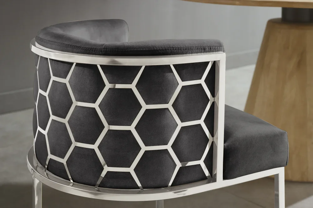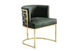 Jídelní křeslo GRAIE je ztělesněním moderní noblesy. Sametové čalounění (100% polyester) dodává povrchu jemný, hebký lesk a vytváří útulnou, ale zároveň luxusní atmosféru. Zlaté nohy z nerezové oceli působí exkluzivně a precizně doplňují design, zatímco dekorativní voštinová struktura po stranách přidává židli unikátní vizuální hloubku. Díky svému vzhledu je křeslo vhodné nejen k jídelnímu stolu, ale také jako stylové křeslo do obývacího koutku či pracovny.