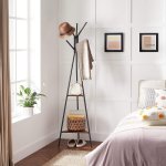 Věšák na kabáty je vyroben z ocelového rámu a silné dřevotřísky a vyznačuje se vynikající odolností a stabilitou; trojúhelníková základna pro větší stabilitu; každý háček unese až 5,5 kg, každá police 10 kg.