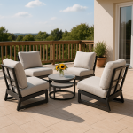 Luxusní hliníkový coffee set v grafitovém provedení, doplněna o stolovou desku z hliníku a pryskyřice. Moderní souprava, která skvěle zapadne do každého exteriéru či interiéru. Souprava má díky použitým materiálům a modernímu vzhledu opravdu široké využití, je vhodná pro vnitřní i venkovní prostory - zahrady, terasy, zimní zahrady nebo třeba do uvítací haly či recepce.